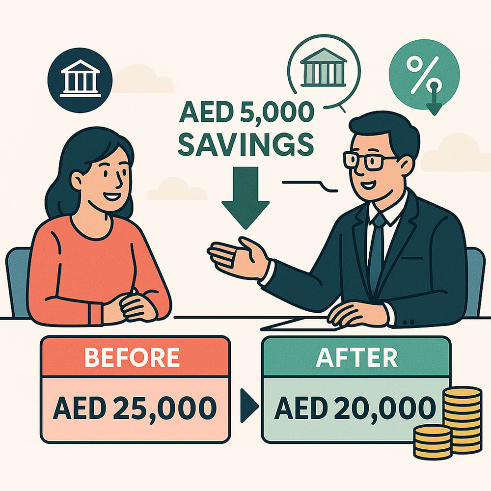 Ahmed had a mortgage loan with a monthly installment of AED 25,000. After consulting with our team, we guided him to transfer his loan to another Bank, where he secured a better interest rate. His new monthly payment is AED 20,000 — saving him AED 5,000 every month. Over a 25-year term, that’s a potential saving of AED 800,000._